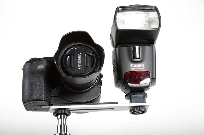 Držák umožňující použití systémového blesku na stativu v ateliéru i exteriéru. Systémový blesk se nasazuje do sáněk na horní straně adaptéru.
